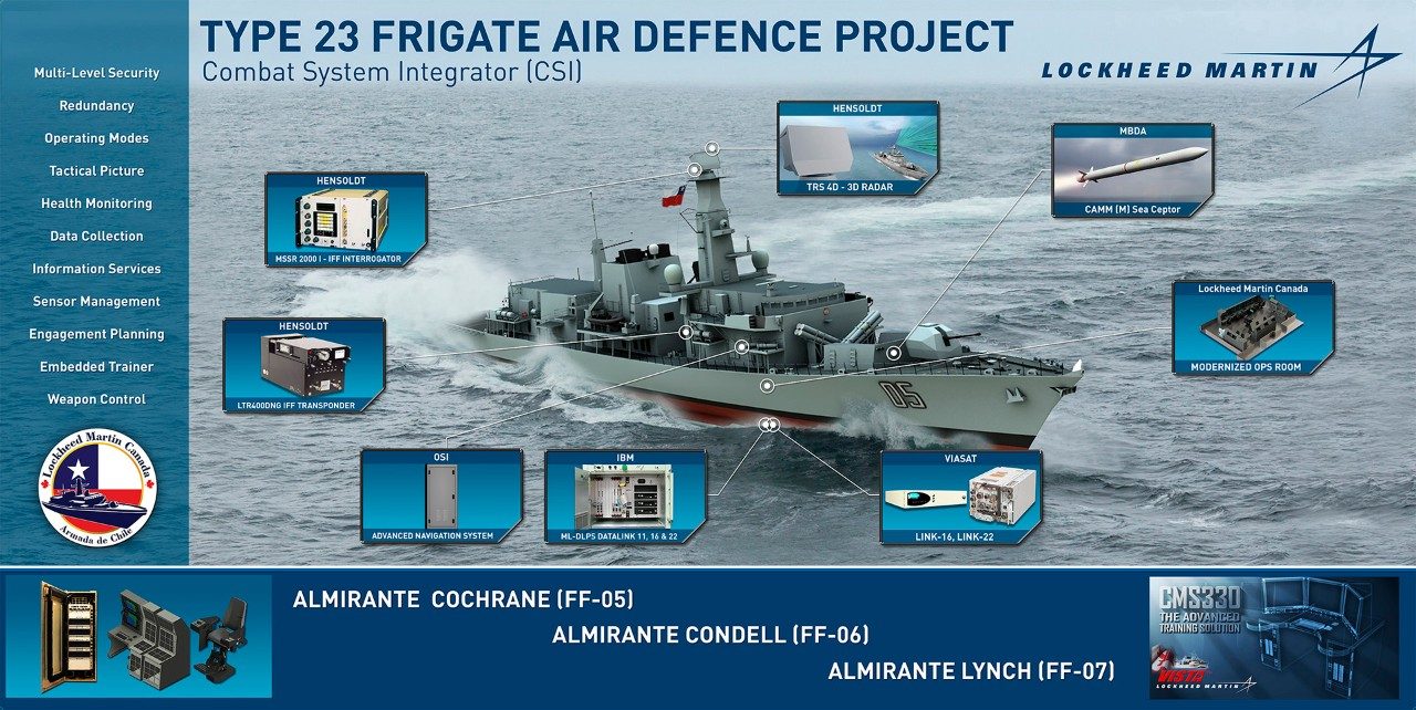 Following an extensive worldwide competitive tender, Lockheed Martin Canada was selected in 2017 to be the combat systems integrator for the Chilean Navy's three Type 23 frigates, leveraging its Canadian-developed combat management system, CMS 330.